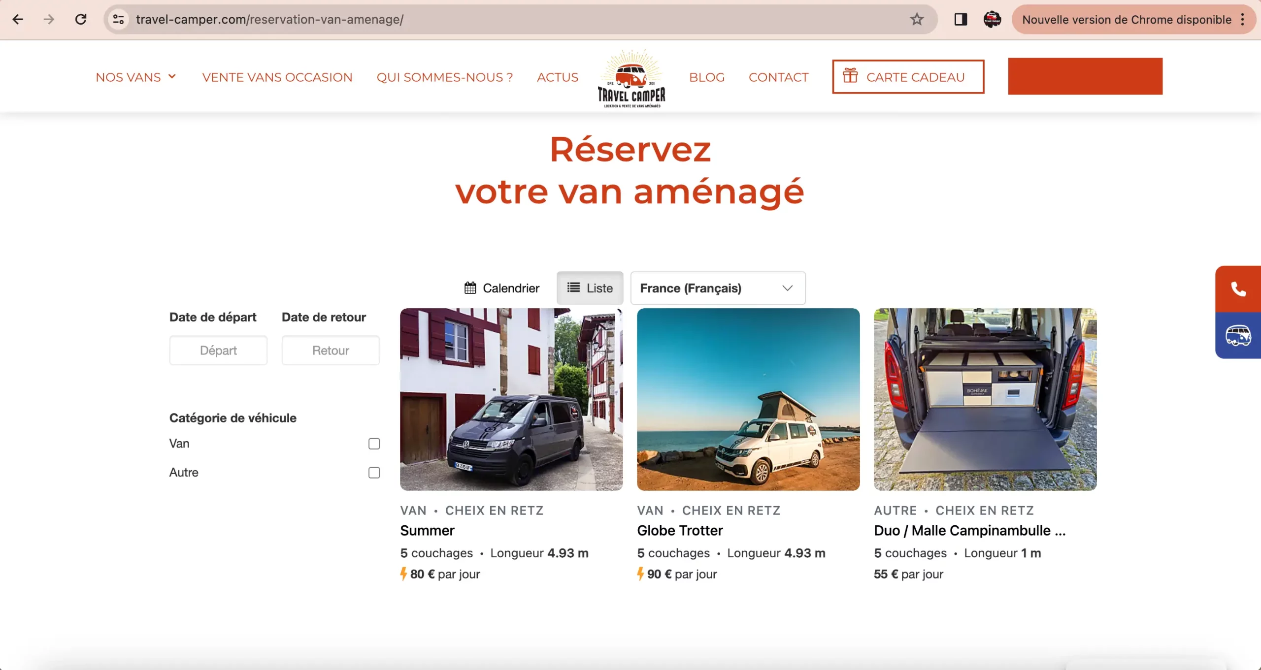 Intégrée directement au site, nous utilisons maintenant Wheelbase. Vous pourrez réserver votre van en toute simplicité en choisissant votre modèle aux dates que vous souhaitez (selon les disponiblités).